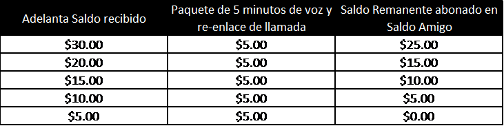 Si el usuario acepta el Adelanta Saldo, adicionalmente se le ofrecerá un paquete de 5 minutos con costo de $5.00 IVA incluido, para re-enlazar la llamada sin la necesidad de terminar la llamada (colgar). Si el usuario acepta el paquete, el sistema intentará llamar al número B marcado. Si el usuario destinatario no contesta, la llamada terminará sin costo para el usuario. Si la llamada es recibida por el destinatario, se debitará el costo de $5.00 del Adelanta Saldo recibido y, en su caso, se abonará el Adelanta Saldo remanente en la cuenta de Saldo Amigo conforme a la siguiente tabla: