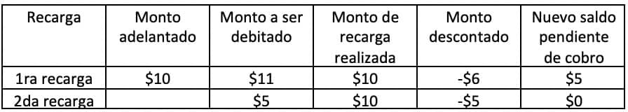 El cargo administrativo y el monto adelantado intentarán ser descontados en su totalidad en la próxima recarga realizada por el usuario.